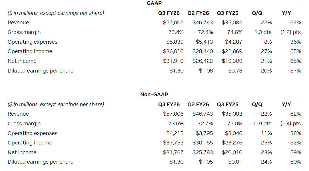 Nel periodo il fatturato ha raggiunto i 57,0 miliardi di dollari, in aumento del 22% rispetto al trimestre precedente e del 62% rispetto all’anno precedente. I margini lordi GAAP e non GAAP sono stati rispettivamente del 73,4% e del 73,6%, mentre l’utile per azione ha raggiunto 1,30 dollari. L’utile netto nel trimestre è aumentato del 65%, passando da 19,31 miliardi di dollari a 31,91 miliardi di dollari.