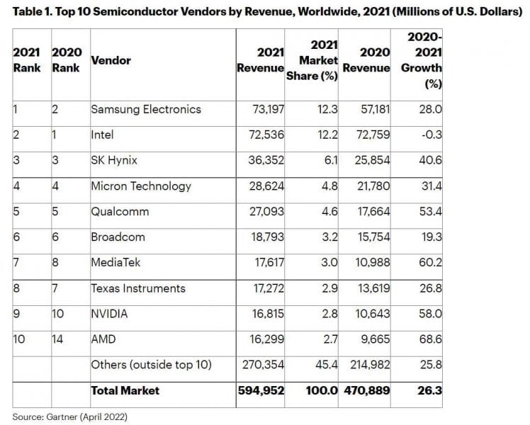 Samsung Electronics ha riconquistato il primo posto della classifica con ricavi in aumento del 28% nel 2021. Le entrate di Intel sono diminuite dello 0,3% facendo scendere la quota di mercato della società americana al 12,2%, rispetto al 12,3% di Samsung. All’interno della top 10, AMD e Mediatek hanno registrato la crescita più forte nel 2021 con un incremento delle vendite, rispettivamente, del 68,6% e del 60,2%.