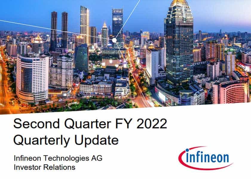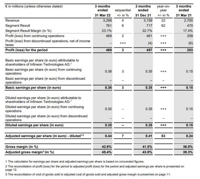 Dopo ST e NXP, anche Infineon Technologies, la terza grande azienda di semiconduttori europea, ha diffuso i dati relativi al trimestre chiuso al 31 marzo 2022 (Q2 FY2022 per la società) che evidenziano ricavi per 3,298 miliardi di euro, in aumento del 4% rispetto al trimestre precedente e del 22% su base annua.
