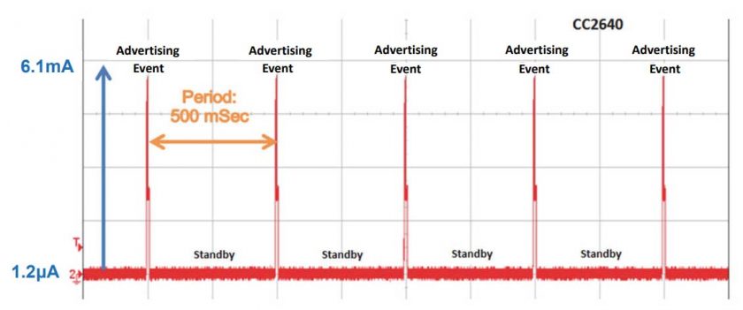 In una smart e-lock, di solito il dispositivo microcontroller (MCU) wireless comunica con il telefono dell’utente per bloccare e sbloccare la porta a distanza. Per fare ciò senza alcun ritardo evidente, il microcontrollore wireless deve essere acceso per inviare periodicamente un segnale (advertising event) per poi essere riportato nello stato di standby. Il consumo di corrente è molto più basso in standby, di solito dell’ordine di qualche microampere (µA). Una corrente così bassa consente una lunga durata della batteria. L’advertising event (da non confondere con gli eventi di blocco/sblocco) si verificano quando il microcontrollore wireless si sveglia periodicamente per trasmettere brevi informazioni identificative e ascoltare le richieste di connessione in arrivo da dispositivi peer (ad esempio uno smartphone). Il periodo degli advertising event nei dispositivi Bluetooth LE nella maggior parte dei casi è programmabile da 20 ms a 10,24 secondi. Più lungo è il periodo, più tempo è necessario per una connessione ma minore è il consumo energetico. Un periodo di 500 ms tra gli advertising event rappresenta un buon equilibrio tra consumo energetico e velocità di connessione. La Figura 1 mostra la forma d’onda del consumo di corrente di un tipico microcontrollore wireless con comunicazione Bluetooth a basso consumo energetico [1]. I valori predefiniti per i consumi di corrente del CC2640 sono mostrati nella Figura 1. I grafici nella Figura 6 e nella Figura 7 (vedi più avanti) utilizzano lo scenario peggiore di 9,1 mA di corrente nello stato atttivo e 2,5 µA di corrente di standby. Questi valori vengono utilizzati per la massima potenza di uscita. Poiché il periodo dell’evento è programmabile, i due valori più importanti da ricercare nella scelta di una radio Bluetooth LE, in termini di consumo energetico, sono le correnti nello stato attivo (durante un advertising event) e di standby.