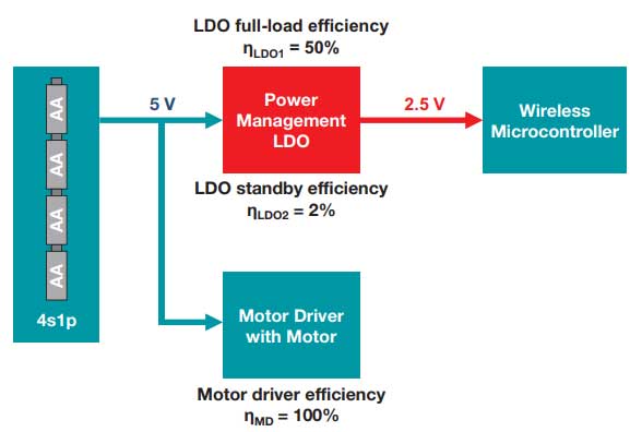 Qualsiasi LDO che converte da 5 V a 2,5 V presenta una efficienza massima del 50 percento, con un’efficienza molto inferiore in modalità standby a causa della corrente di riposo dell’LDO (a volte chiamata ground current) [3]. Ad esempio, il TPS76625 è adatto per convertire la tensione di quattro batterie AA a 2,5 V. Questo dispositivo raggiunge il 50 percento di efficienza in presenza di carico elevato, ma solo il due percento di efficienza con un carico in standby di 1,2 µA per effetto della sua corrente di riposo di 35 µA. L’efficienza molto bassa si traduce in un consumo energetico relativamente elevato quando la serratura intelligente è in standby, riducendo la durata della batteria. La Figura 2 mostra un tipico diagramma a blocchi di un sistema basato su LDO.