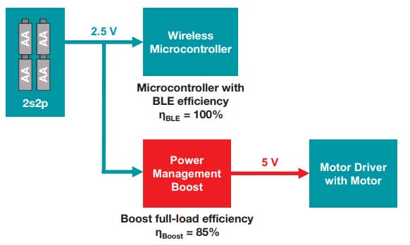 Per superare la bassa efficienza dell’LDO in modalità standby, la configurazione della batteria viene riorganizzata e viene utilizzato un convertitore boost. In questa architettura di alimentazione, l’MCU wireless si collega direttamente al pacco batteria, che è configurato come 2s2p (due serie e due celle parallele). Poiché vengono ancora utilizzate quattro celle, il costo e l’energia disponibile sono gli stessi del caso precedente. Ma poiché ci sono solo due celle in serie, la tensione totale del pacco batteria è di soli 2,5 V, una combinazione perfetta per l’MCU wireless. In questo modo, la connessione è efficiente al 100%. Tuttavia, il motore richiede ancora 5 V per funzionare. Dalla batteria da 2,5 V è perciò necessario utilizzare un convertitore boost. Un tipico convertitore boost, come il TPS61030, ha un’efficienza di circa l’85% quando viene utilizzato per azionare un motore. A causa dell’efficienza e del rapporto boost (dove la tensione di uscita è maggiore della tensione di ingresso), il convertitore boost assorbe correnti molto elevate dalla batteria che aumentano le perdite. La Figura 3 mostra un tipico diagramma a blocchi di un sistema basato su boost.