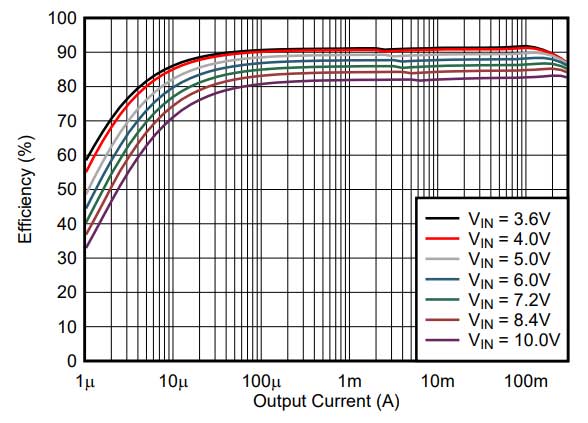 Figura 5. L’efficienza di un convertitore buck a bassissima potenza rimane elevata, anche con carichi molto bassi.