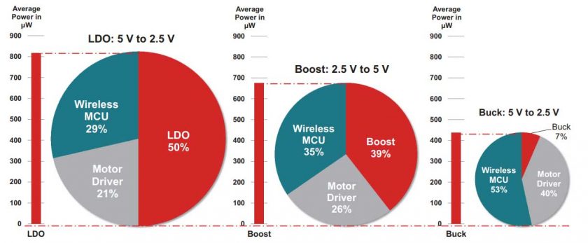 Utilizzando la stessa architettura di alimentazione del sistema LDO, viene utilizzato ora un convertitore buck al posto dell’LDO per aumentare l’efficienza. Con il microcontrollore wireless in funzione, il convertitore buck, come un TPS62745, è efficiente al 90%. Il sottosistema motore mantiene un’efficienza quasi del 100% perché è collegato direttamente al pacco batteria. La Figura 4 mostra un tipico diagramma a blocchi di un sistema buck. Un convertitore buck standard ha una corrente di riposo (IQ) relativamente grande. L’alta IQ riduce drasticamente l’efficienza in modalità standby come nel caso dell’DO [3]. Tuttavia, il convertitore buck a bassissima potenza utilizzato in questo esempio ha una IQ ultra bassa, progettata specificamente per le applicazioni IoT, che hanno correnti di picco più elevate e lunghi tempi di standby del sistema. La Figura 5 mostra che l’IQ ultra-basso consente un’efficienza superiore al 67% alle correnti di carico tipiche in modalità standby con una tensione di uscita di 2,5 V.