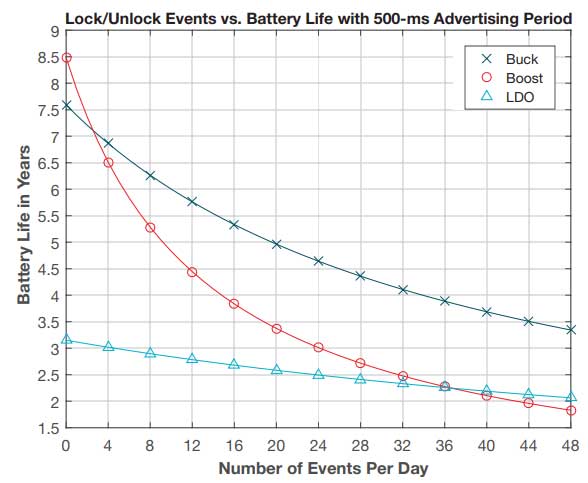 La Figura 7 confronta tutte le tre architetture di alimentazione con il numero di eventi di blocco/sblocco sull’asse x e il numero di anni di durata della batteria sull’asse y. Per molte applicazioni, che hanno meno di 36 eventi al giorno, entrambe le architetture buck e boost offrono un miglioramento della durata della batteria rispetto all’architettura LDO. Per i sistemi di eventi di blocco/sblocco più elevati, l’architettura buck è ancora la migliore, ma l’architettura boost diventa peggiore dell’architettura LDO a causa della maggiore quantità di potenza del motore richiesta per più eventi.