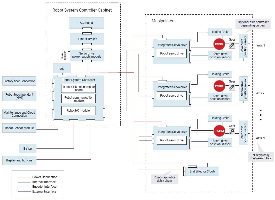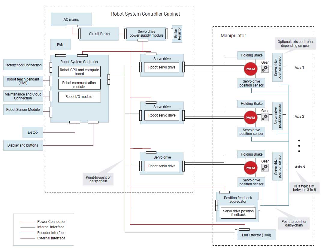 Sebbene le architetture di controllo centralizzato possano soddisfare i requisiti di progettazione di prestazioni ed efficienza di sistemi automatizzati ad alta potenza come i robot industriali con carico utile elevato, sono richiesti cavi aggiuntivi dall’armadio al motore meccanico nel giunto, nonché dai sensori di posizione e dagli aggregatori. Questi cavi non solo costano di più, ma si usurano e richiedono manutenzione.