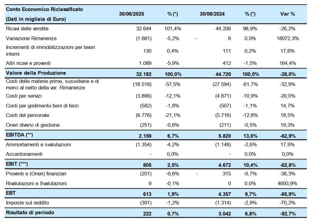 Rispetto al primo semestre 2024 il fatturato passa da 44,2 milioni di euro a 32,6 milioni (-28%) mentre l’utile netto crolla da 3,042 a 0,222 milioni di euro (-92,7%). Secondo l’azienda il calo è dipeso dalla mutevole situazione geopolitica e da una consistente attività di destocking delle aziende.