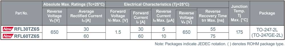 ROHM ha sviluppato le serie RFL/RFS di diodi fast recovery (FRD) da 650 V di quarta generazione, che si distinguono rispettivamente per una bassa tensione diretta (VF) e un tempo di reverse recovery (trr) veloce, nonché per caratteristiche di rumore ultra-basso. I nuovi dispositivi sono ideali per apparecchiature industriali e di consumo che gestiscono grandi quantità di potenza, come climatizzatori e stazioni di ricarica di veicoli elettrici.