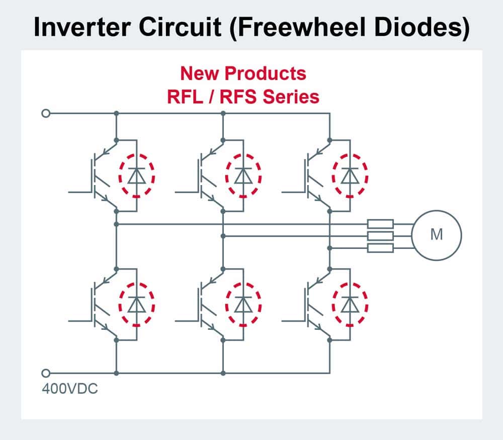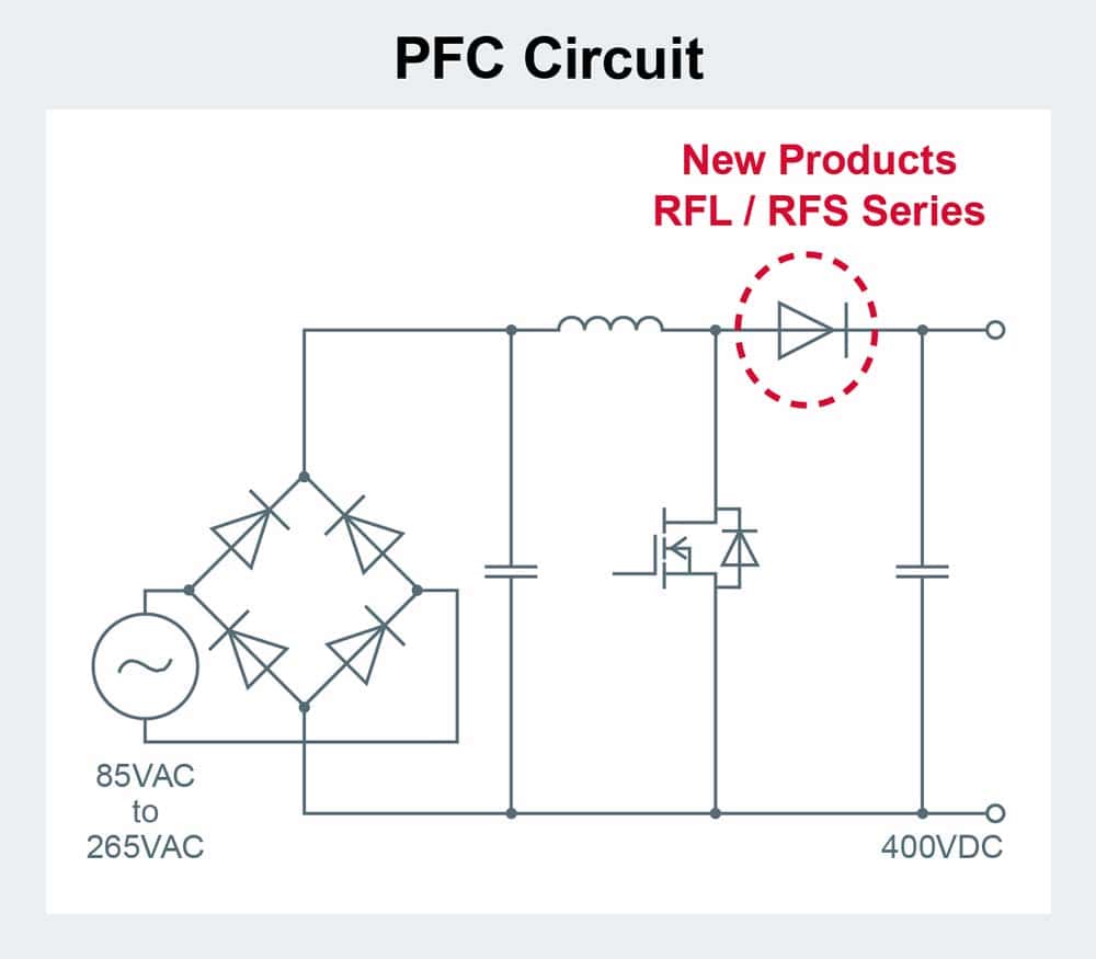 Negli ultimi anni si è reso necessario un uso più efficiente dell’energia elettrica al fine di far fronte all’aumento di consumo di potenza a livello globale. Aspetto particolarmente importante per i grandi elettrodomestici e le apparecchiature industriali che gestiscono grandi quantità di potenza, come le stazioni di ricarica di veicoli elettrici. Questi richiedono non solo un’elevata efficienza elettrica, ma anche la riduzione del carico di lavoro, quando le misure per contrastare il rumore implicano il contrario nella progettazione dei circuiti. Per rispondere a questa esigenza, ROHM ha sviluppato diodi che uniscono una bassa VF, per un funzionamento più efficiente, a caratteristiche di trr veloce, che garantiscono minori perdite e un rumore ultra-basso durante la disattivazione.