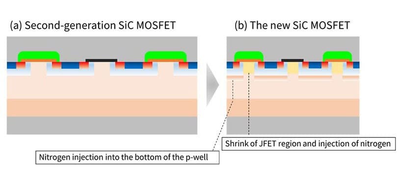 Toshiba ha ora sviluppato un’architettura che riduce RonA includendo un SBD. Il valore della resistenza di diffusione (Rspread) viene ridotta e la corrente SBD viene aumentata iniettando azoto nella parte inferiore dell’ampia regione di diffusione di tipo p (p-well) del MOSFET SiC.
