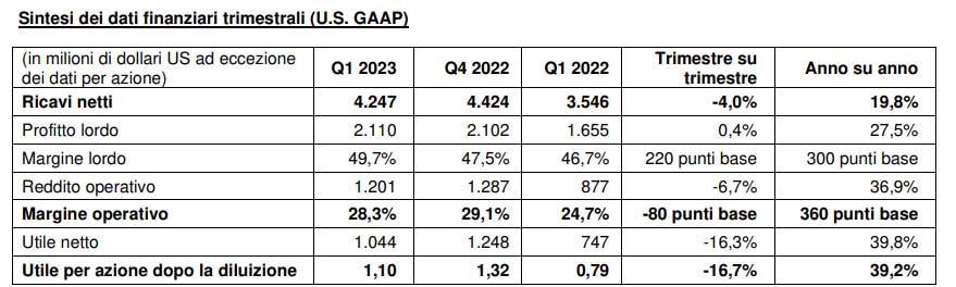 I risultati sequenziali sono leggermente in calo ma le entrate del periodo di 4,247 miliardi di dollari sono del 19,8% più alte rispetto a quello dello stesso periodo del 2022. Ancora più forte è l’incremento dell’utile netto che nel trimestre sale a 1,044 miliardi contro i 747 milioni del Q12022 (+39,8%).