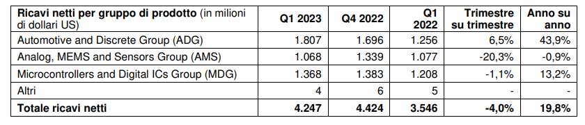 È evidente – rispetto al trimestre precedente – il forte calo del mercato analogico e consumer i cui prodotti sono compresi nel gruppo AMS (Analog, MEMS and Sensor Group); manifesta ancora una buona forza il comparto ADG (Automotive and Discrete Group) che comprende anche i dispositivi di potenza e quelli con tecnologia SiC, e che è cresciuto del 6,5% rispetto al trimestre precedente e di ben il 43,9% rispetto al trimestre di un anno fa.