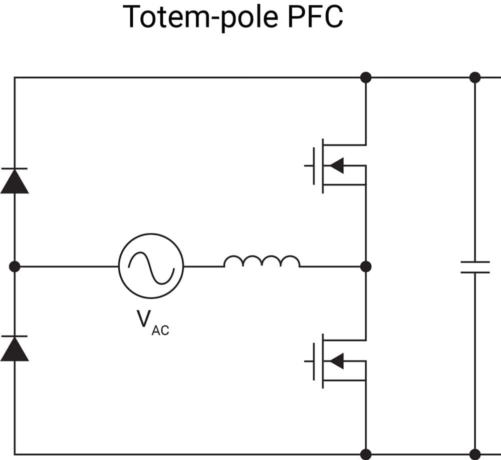 Nella maggior parte del mondo, è necessario uno stadio di correzione del fattore di potenza (PFC) una volta raggiunti livelli di potenza superiori a 70 W. In questo contesto, per sfruttare al massimo le capacità della tecnologia GaN, la topologia più adatta a quella PFC totem-pole, come mostrato nella Figura 3. La rimozione del raddrizzatore a ponte rafforza il valore dei FET GaN in questa topologia, date le perdite pari a zero per il recupero inverso.
