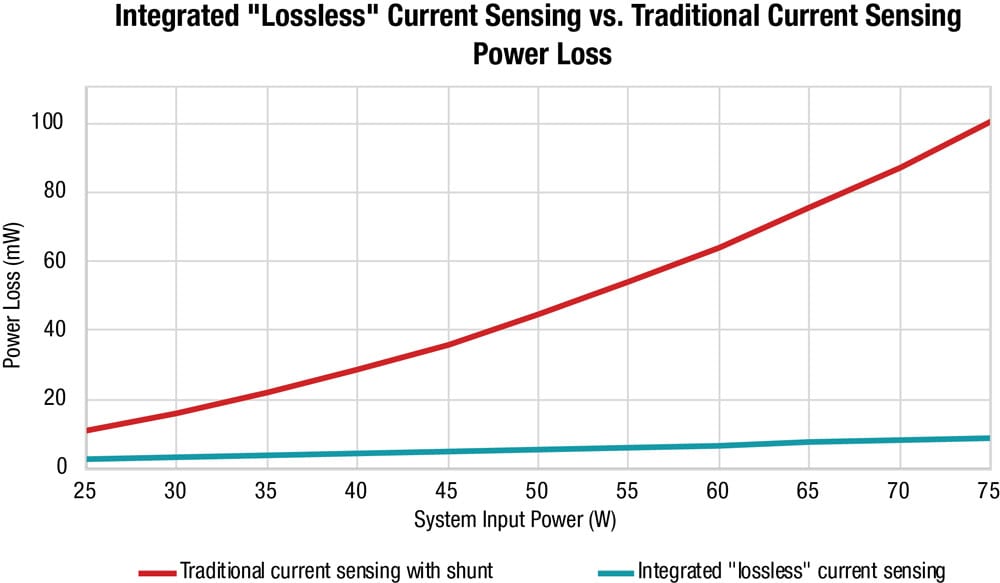Figura 2: Perdita di potenza con rilevamento di corrente integrato rispetto alla perdita di potenza del rilevamento di corrente tradizionale.