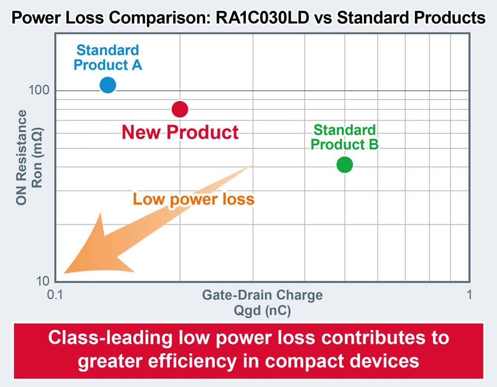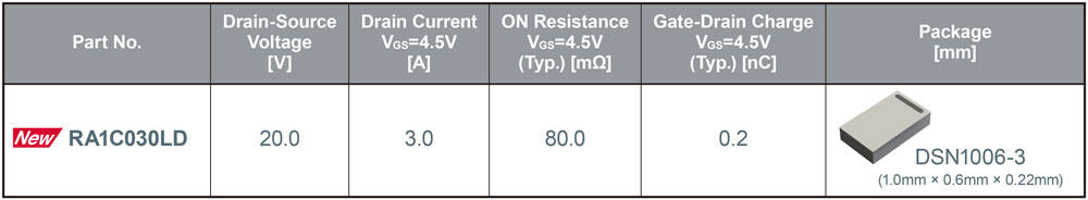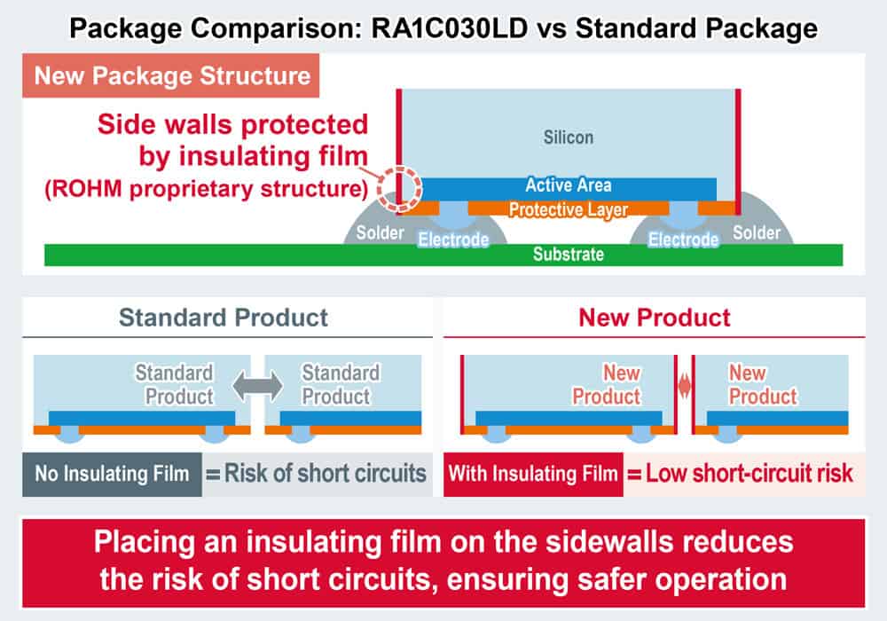 Il dispositivo RA1C030LD viene proposto in package di tipo wafer-level chip-size DSN1006-3 (1,0 mm × 0,6 mm) che fa tesoro delle tecnologie proprietarie di processo di ROHM per ottenere una bassa dissipazione di potenza unita a una ulteriore miniaturizzazione. Relativamente al rapporto tra perdita di conduzione e perdita di commutazione (RDSON × Qgd, ossia carica gate-drain), si è raggiunto un valore ai vertici del settore, vale a dire inferiore del 20% rispetto ai prodotti in package standard con lo stesso package (1,0 mm × 0,6 mm o inferiore), contribuendo così a ottenere un’area della scheda sensibilmente più piccola unitamente a un’efficienza più elevata in un gran numero di dispositivi compatti. Al tempo stesso, la struttura del package di ROHM – unica nel suo genere – impiega protezioni isolanti sulle pareti laterali (diversamente dai prodotti standard con lo stesso package privo di protezione). In tal modo si riduce il rischio di cortocircuiti dovuti al contatto fra componenti adiacenti in dispositivi ad elevata densità, contribuendo così a un funzionamento più sicuro.