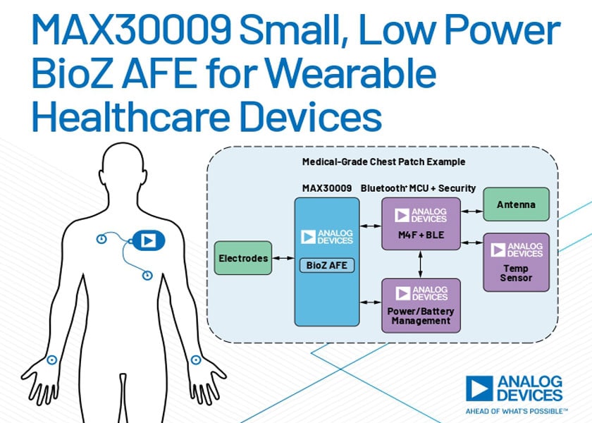 Con il front-end analogico (AFE) MAX30009 BioZ a bassa potenza e ad alte prestazioni di Analog Devices (ADI), è possibile ridurre le dimensioni ed estendere la vita dei sistemi di misura di bioimpedenza (BioZ) per il monitoraggio remoto dei pazienti.