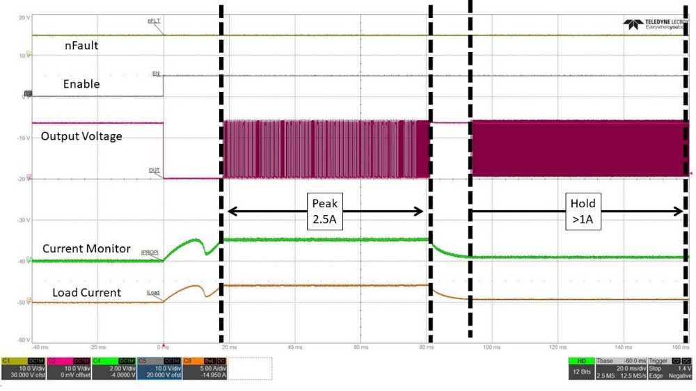 La Figura 2 mostra questa funzionalità in azione. È possibile fornire più corrente durante l’avvio per effettuare la connessione iniziale. Dopo aver effettuato il collegamento, nella fase di “mantenimento” la corrente può essere ridotta ad un livello inferiore. La possibilità di programmare le fasi di picco e mantenimento fornisce un’attivazione più robusta ed efficiente del contattore.