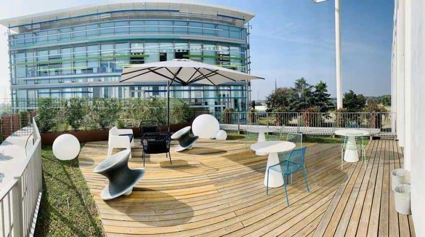 Nella sede di Vimercate di Micron Semiconductor ci sono anche spazi di interazione all’aperto da utilizzare durante la bella stagione.