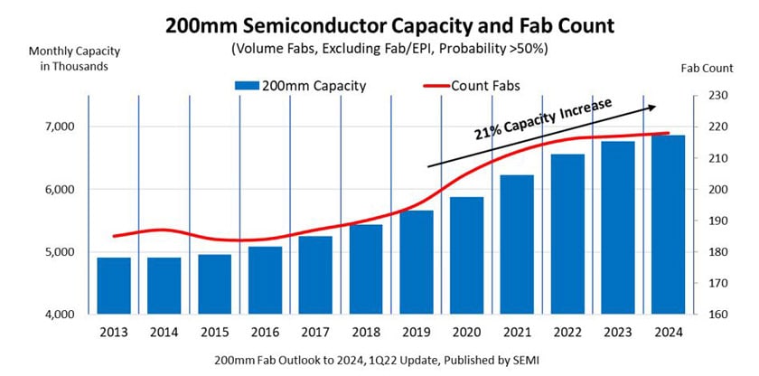 SEMI – l’associazione tra i principali produttori di semiconduttori al mondo – segnale nel report che nel periodo 2020 – 2024 la capacità produttiva di semiconduttori degli impianti da 200 mm (8”) aumenterà di 1,2 milioni di wafer al mese, pari al 21%, raggiungendo la cifra record di 6,9 milioni di wafer/mese.