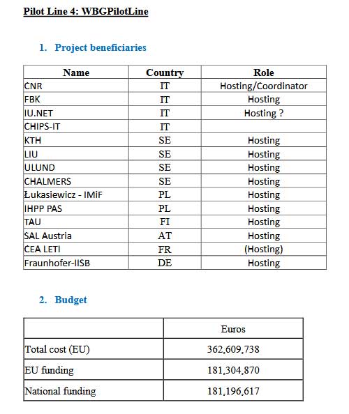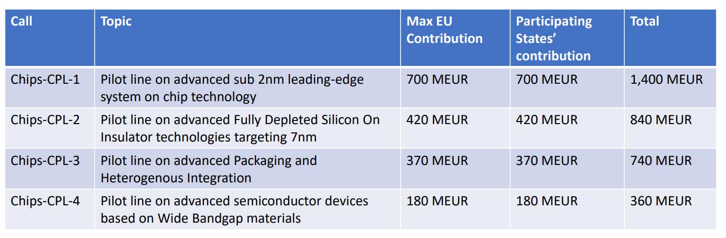 Gli stanziamenti relativi sono quelli indicati in tabella; i maggiori finanziamenti andranno al progetto guidato dall’imec relativo ai nodi di processo a 2 nm. Quello italiano, guidato dal CNR, riceverà appena (si fa per dire) 360 milioni di euro circa.