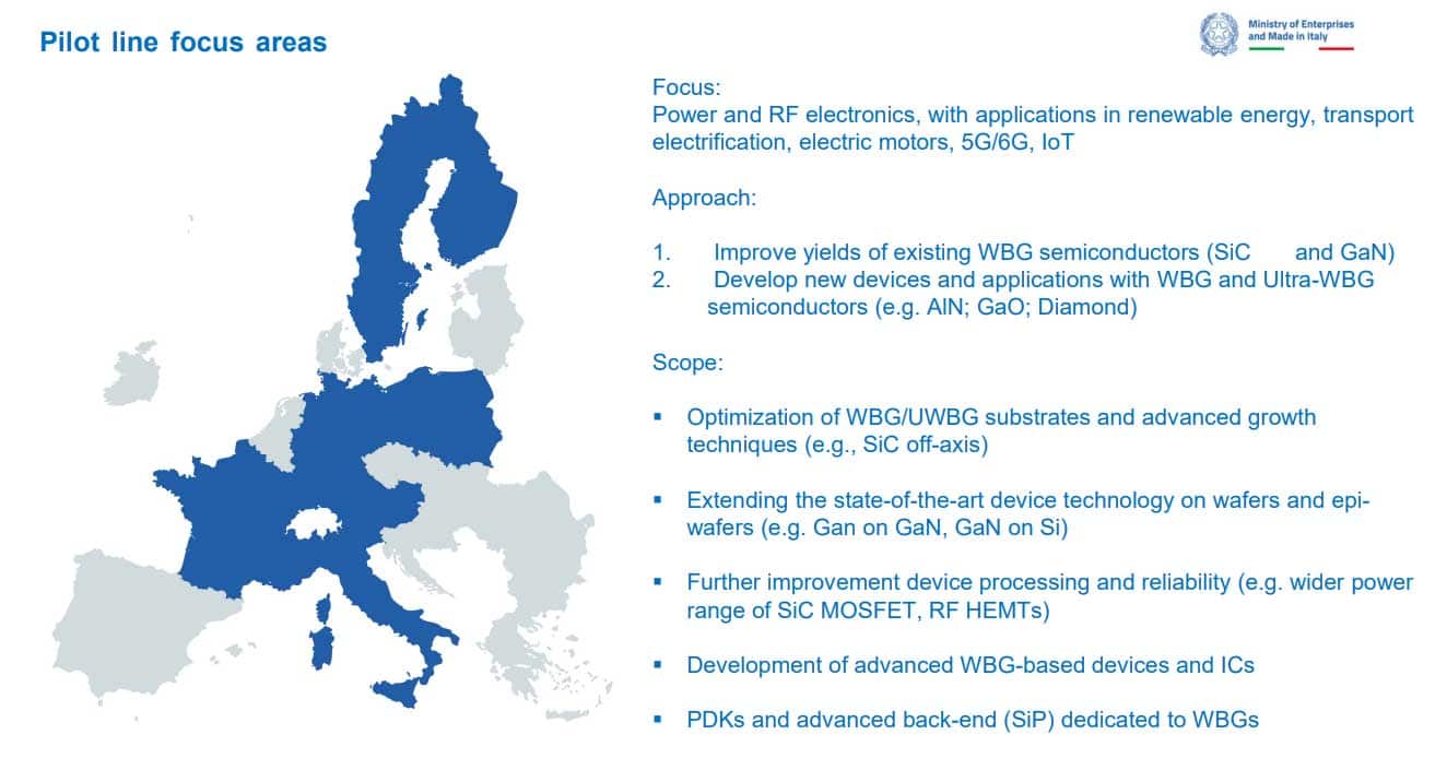 Come si vede nella seguente tabella, il focus della Linea Pilota assegnata al nostro paese riguarda lo sviluppo delle tecnologie dei semiconduttori ad ampia banda proibita (WBG, SiC e GaN) per l’elettronica di potenza e per radiofrequenza (RF).