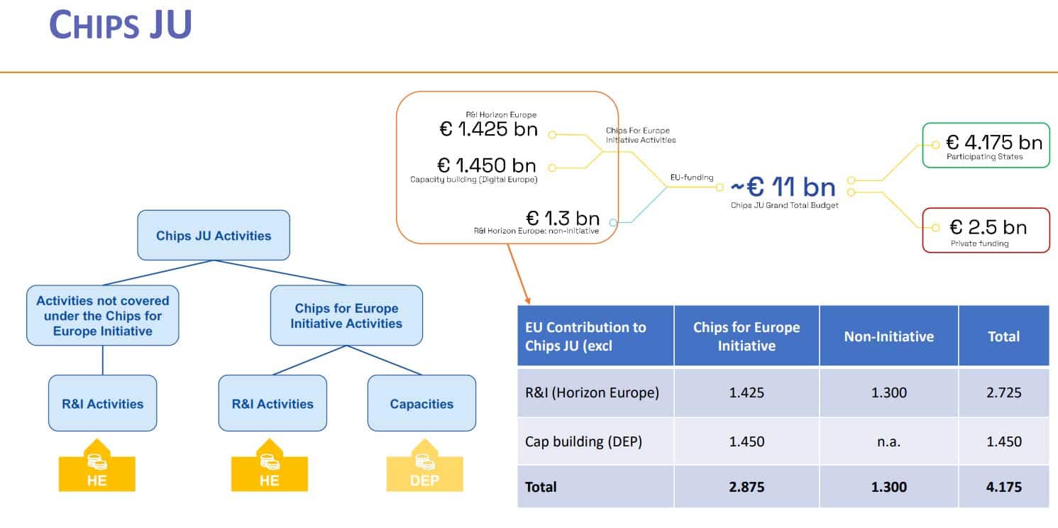 I progetti e le attività del Chips Joint Undertaking (Chips JU) mobiliteranno circa 11 miliardi di euro, parte dei quali arriveranno da precedenti progetti, dai singoli stati e dalle aziende private che parteciperanno alle varie iniziative. Un quadro abbastanza complesso che Jari Kinaret, Executive Director Chips Joint Undertaking, durante l’incontro di Roma del 6 marzo 2024, ha cercato di semplificare proponendo il seguente schema: