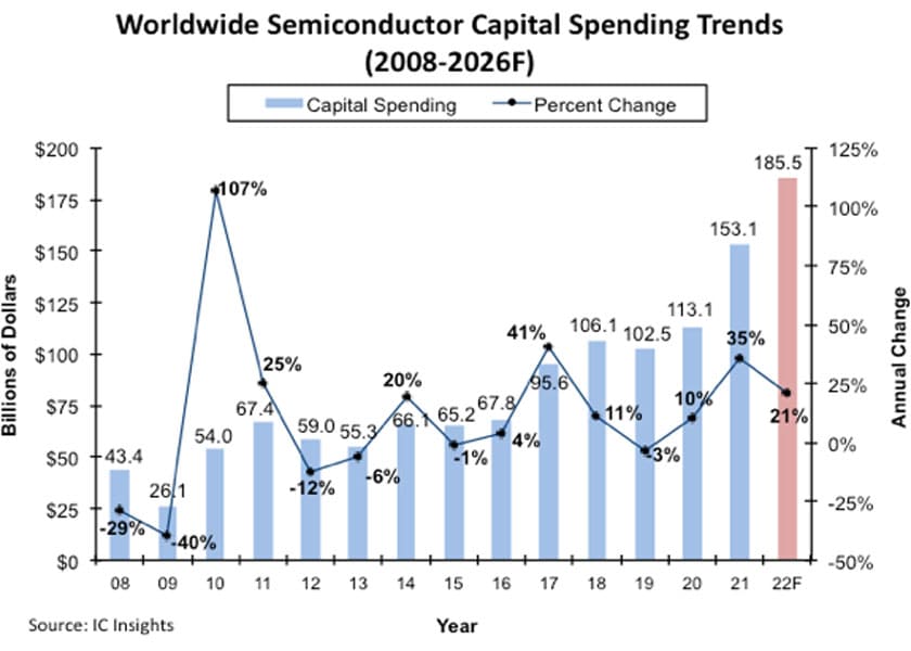 IC Insights, società globale di ricerche di mercato e consulenza, ha rettificato le sue previsioni sulla spesa in conto capitale mondiale dei semiconduttori per il 2022, che ora mostrano un aumento del 21% a quota 185,5 miliardi di dollari, una lieve riduzione delle previsioni di inizio anno che fissavano in 190,4 miliardi la spesa in capex (+24% rispetto al 2021).