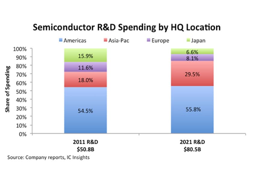 Secondo IC Insights le società statunitensi hanno contribuito alle spese globale di ricerca e sviluppo con una quota del 56%, che si è mantenuta costante negli ultimi 10 anni. La quota delle società dell’area Asia-Pacifico ha raggiunto un terzo della spesa complessiva.