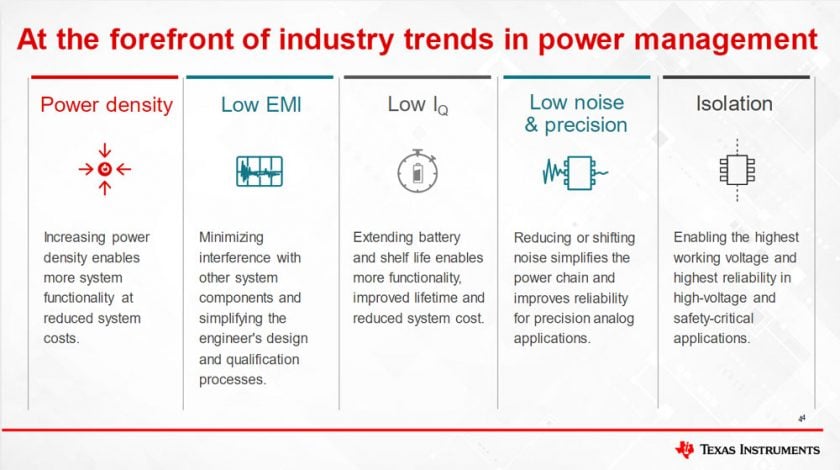 In una tavola rotonda che ha preceduto la manifestazione, tre esperti di Texas Instruments, Jeff Morroni, Manager Power Management R&D at KilbyLabs, Carsten Oppitz, Vice president and general manager Buck Switching Regulators e Alex Chin, Vice president and general manager Linear Power, hanno discusso sulle ultime tendenze e sulle soluzioni di Power Management, identificando i principali trend di mercato ai quali i produttori come Texas Instruments debbono fornire adeguate risposte: