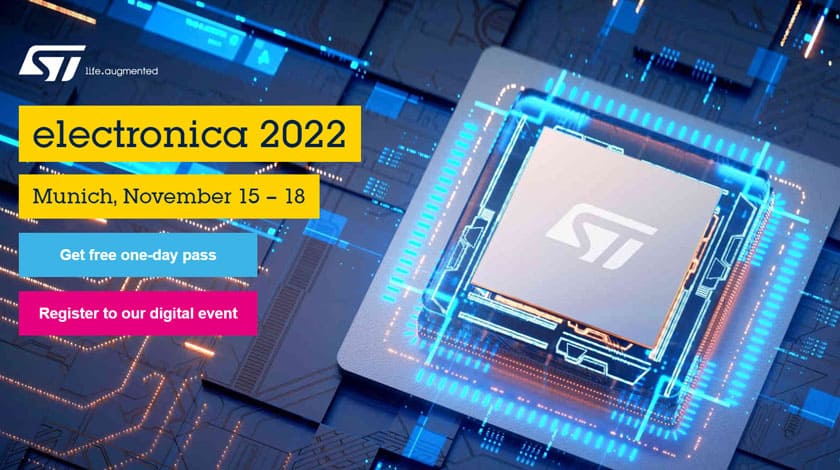 STMicroelectronics sarà presente al Padiglione C3 Stand 101 di “electronica2022”. Questo il link per registrarsi all’evento live digitale di ST: https://content.st.com/electronica-2022-digital-event-registration.html.