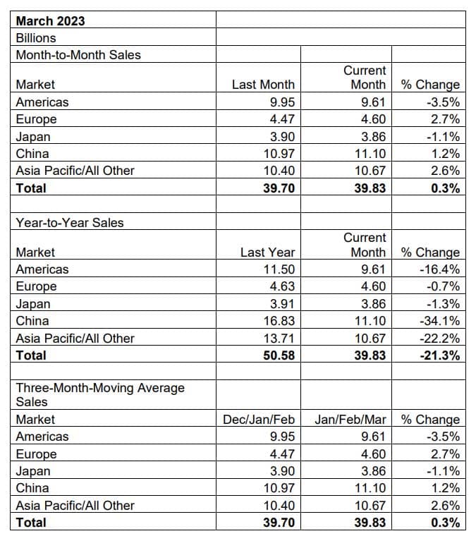 A livello regionale, le vendite mensili sono aumentate in Europa (2,7%), Asia Pacifico/Tutti gli altri (2,6%) e Cina (1,2%), ma sono diminuite in Giappone (-1,1%) e nelle Americhe (-3,5%). Le vendite anno su anno sono diminuite in tutte le regioni: Europa (-0,7%), Giappone (-1,3%), Americhe (-16,4%), Asia Pacifico/Tutte le altre regioni (-22,2%) e Cina (-34,1%).