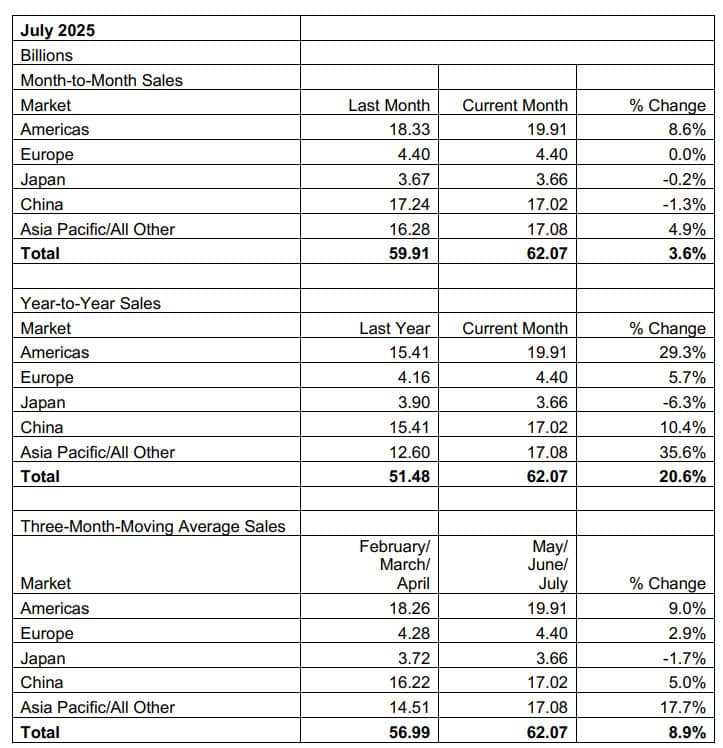 Semiconductor Industry Association (SIA) ha annunciato oggi che le vendite globali di semiconduttori hanno raggiunto il livello record di 62,1 miliardi di dollari nel mese di luglio 2025, con un aumento del 20,6% rispetto al totale di luglio 2024 di 51,5 miliardi di dollari e del 3,6% rispetto al totale di giugno 2025 di 59,9 miliardi di dollari.