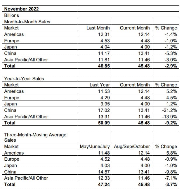 Rispetto al mese di ottobre, le vendite mensili a novembre sono diminuite in tutte le regioni: Europa (-1,0%), Giappone (-1,2%), Americhe (-1,4%), Asia Pacifico/Tutti gli altri (-3,0%) e Cina (-5,3 %).