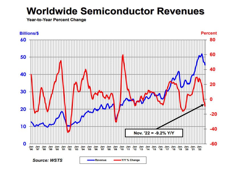 È continuato anche nel mese di novembre il calo di vendite di semiconduttori a livello globale che ha portato ad una diminuzione su base annua del 9,2%. Vanno decisamente male le vendite di memorie e processori e, a livello regionale, continua la pesante crisi del mercato cinese che anche nel mese di novembre ha fatto segnare un calo del 5,3% rispetto ad ottobre.