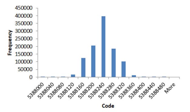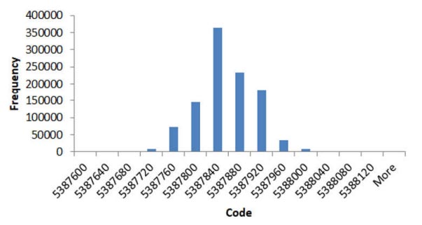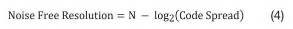 Mentre l’ENOB rappresenta la risoluzione dell’uscita dell’ADC, non tiene conto delle prestazioni DC. Per comprendere le implicazioni di risoluzione del rumore da un ingresso DC all’ADC, consideriamo di trovare la risoluzione noise-free del circuito. Utilizzando l’equazione 4 è possibile calcolare la risoluzione noise-free osservando la diffusione del codice in numero di bit meno significativi (LSB) dell’uscita digitale di un ADC durante la misurazione di un segnale DC:
