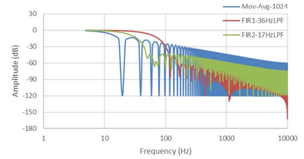 I sistemi ad alta precisione utilizzano tecniche di elaborazione dati per migliorare la precisione e aumentare la risoluzione complessiva. In questo caso abbiamo convertito i dati grezzi a 20 bit dall’ADS8900B in una lunghezza a 24 bit moltiplicando l’uscita per 16. Diversi filtri FIR (Finite Impulse Response) hanno elaborato i dati convertiti a 24 bit. I filtri FIR sono facili da implementare e si stabilizzano più velocemente se si verifica una modifica nei valori di input. La velocità dei dati in uscita rimane a 20 kSPS, ma con latenza definita dalle caratteristiche del filtro.