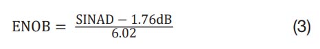 Dall’equazione 2, è possibile vedere che all’aumentare dell’SNR, aumenta anche il SINAD. Quindi, meno rumore e distorsione sono presenti, migliore è il SINAD. Utilizzando il SINAD, si può usare l’equazione 3 per trovare facilmente l’ENOB dell’ADC: