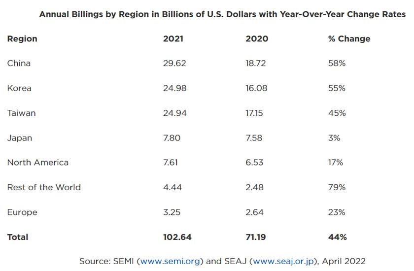 Le vendite globali di apparecchiature per la lavorazione dei wafer sono aumentate del 44% nel 2021, mentre le vendite del segmento front-end sono cresciute del 22%. L’assemblaggio e l’imballaggio hanno mostrato una crescita eccezionale in tutte le regioni, determinando un aumento del mercato dell’87% nel 2021, mentre le vendite totali di apparecchiature di test sono aumentate del 30%.