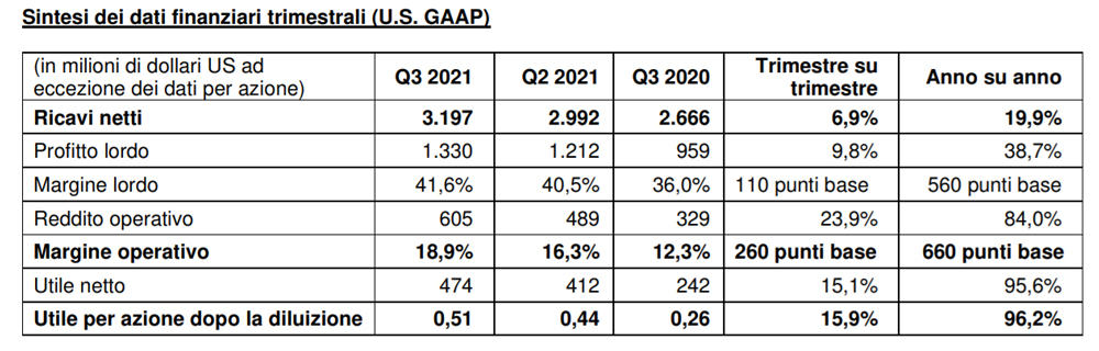 Il margine lordo del terzo trimestre è stato di 60 punti base al di sopra del valore intermedio della guidance della Società, a causa principalmente di un mix di prodotto migliore. Il reddito operativo è aumentato dell’84,0% a 605 milioni di dollari, rispetto a 329 milioni di dollari nello stesso trimestre dell’anno scorso. Anno su anno, il margine operativo della Società è migliorarto di 660 punti base al 18,9% dei ricavi netti, rispetto al 12,3% nel terzo trimestre del 2020.