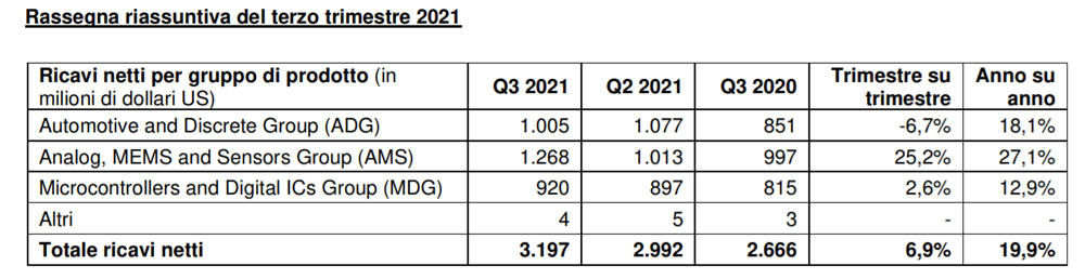 STMicroelectronics ha annunciato i risultati finanziari del terzo trimestre 2021, conclusosi il 2 ottobre 2021, che evidenziano ricavi netti pari a 3,20 miliardi di dollari, un margine lordo al 41,6%, un margine operativo al 18,9% e un utile netto di 474 milioni di dollari pari a 0,51 dollari per azione dopo la diluizione.