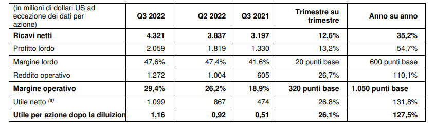 - Ricavi netti del terzo trimestre a 4,32 miliardi di dollari; margine lordo al 47,6%; margine operativo al 29,4%; utile netto a 1,10 miliardi di dollari