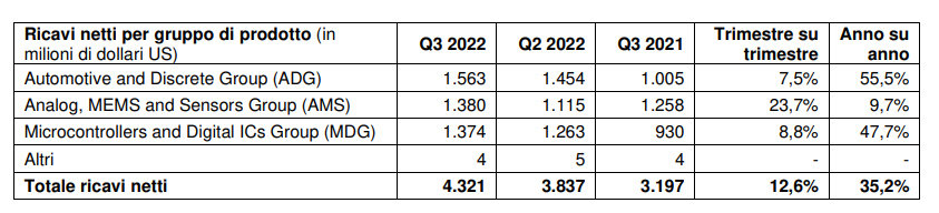 Per quanto riguarda i ricavi per categorie di prodotto, la seguente tabella evidenzia il balzo, nel trimestre, dei ricavi relativi alla categoria Analog, MEMS e Sensors Group (AMS). A partire da 1° luglio 2022, la business unit Power RF è stata trasferita dal gruppo AMS al gruppo MDG (con i valori dei periodi precedenti che sono stati ricalcolati):
