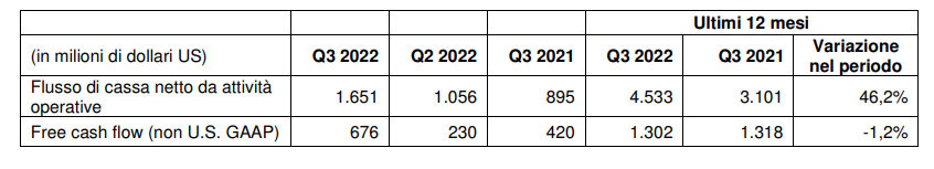 Nel terzo trimestre il free cash flow (parametro non U.S. GAAP) era pari a 676 milioni di dollari, rispetto a 420 milioni di dollari nello stesso trimestre dello scorso anno.