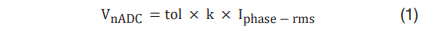 dove, VnADC è il livello di rumore richiesto dall’ADC, tol è la precisione di misura specificata in percentuale per una data corrente di fase, Ifase-rmsin ampere e k è la costante di sensibilità della bobina di Rogowski in microvolt per ampere.