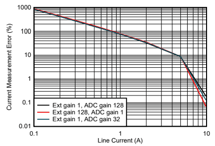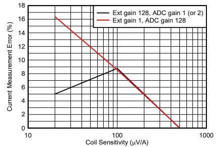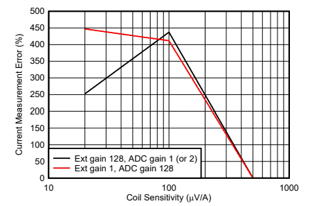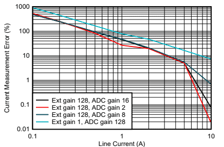 Utilizzando bobine PCB con una sensibilità ≥100 μV/A (vedere Figura 4), la selezione del guadagno interno rispetto a quello esterno genera un errore comparabile, a indicare che l’ampiezza di uscita del sensore è ora ben al di sopra del livello di rumore di quantizzazione per l’intervallo di corrente di fase rilevante. Il valore assoluto dell’errore risultante è superiore a quello accettabile per alcuni sistemi di misurazione dell’energia di livello economico, che mirano a una precisione ≤0,5%. Questo errore maggiore è il risultato di una procedura di calibrazione semplificata applicata in questa configurazione: una calibrazione (guadagno) a punto singolo. In un tipico progetto di misurazione, l’applicazione di un massimo di tre fasi di calibrazione (calibrazione dell’offset, calibrazione del guadagno e calibrazione di fase) può ridurre ulteriormente l’errore assoluto.