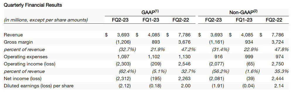 Un anno fa Micron aveva registrato vendite per 7,79 miliardi di dollari mentre nel FQ2-23 le vendite sono scese a 3,69 miliardi di dollari, addirittura meno di quanto stimato dagli analisti. Nello stesso periodo la società ha registrato una perdita netta di 2,31 miliardi di dollari contro un utile di 2,2 miliardi di un anno fa. Questi dati fanno seguito alla perdita di 195 milioni del trimestre precedente. Cifre da fare tremare i polsi.