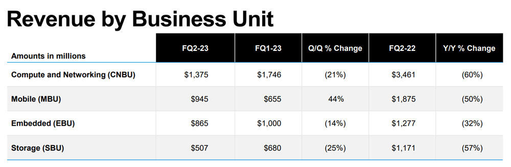 Nessun mercato finale è stato risparmiato dal calo delle vendite, anche se nel trimestre appena concluso il business delle memorie per dispositivi mobili è cresciuto del 44 %, pur risultando in calo del 50% anno su anno.