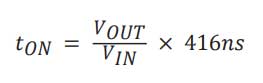 Una topologia COT come DCS-Control imposta il tempo di attivazione con un timer. Regolando questo tempo di attivazione con la tensione di ingresso e di uscita, il timer fornisce un funzionamento a frequenza ragionevolmente costante per la maggior parte dei cicli di lavoro in modalità PWM (modulazione di larghezza di impulso). L’equazione 1 mostra un esempio, dove 416ns è il periodo per una frequenza di commutazione di 2,4 MHz.