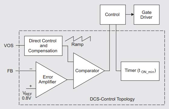 Questa compensazione esterna consente di ottimizzare il circuito di controllo in base a qualsiasi esigenza: dai sistemi con transitori di carico elevati con grande capacità di uscita, fino ai sistemi con transitori di carico piccoli o assenti con capacità di uscita molto ridotta e dimensioni ridotte. A differenza del DCS-Control, il percorso di feedback veloce passa attraverso questo amplificatore, e non immediatamente al comparatore, per poter aumentare o diminuire il guadagno selezionando il componente di compensazione.  Se è necessaria una risposta transitoria più forte, si aumenta il guadagno e si aggiunge più capacità di uscita. Se nell’applicazione non sono presenti transitori forti, va diminuito il guadagno utilizzando una piccola capacità di uscita, anche al fine di ridurre le dimensioni.