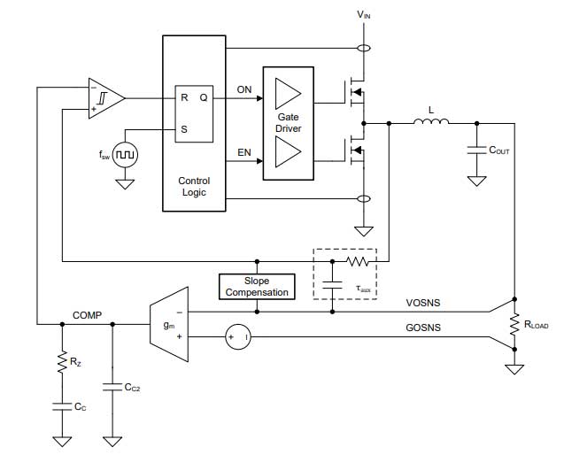 I segnali differenziali raggiungono così l’amplificatore a transconduttanza (gm), che confronta la loro differenza con il setpoint della tensione di uscita. (Per semplicità, la Figura 2 mostra questo setpoint come una sorgente di tensione in serie con il segnale GOSNS.) Il pin COMP fornisce l’uscita di questo amplificatore, che è compensata con una rete di Tipo II (one pole, one zero) a terra.